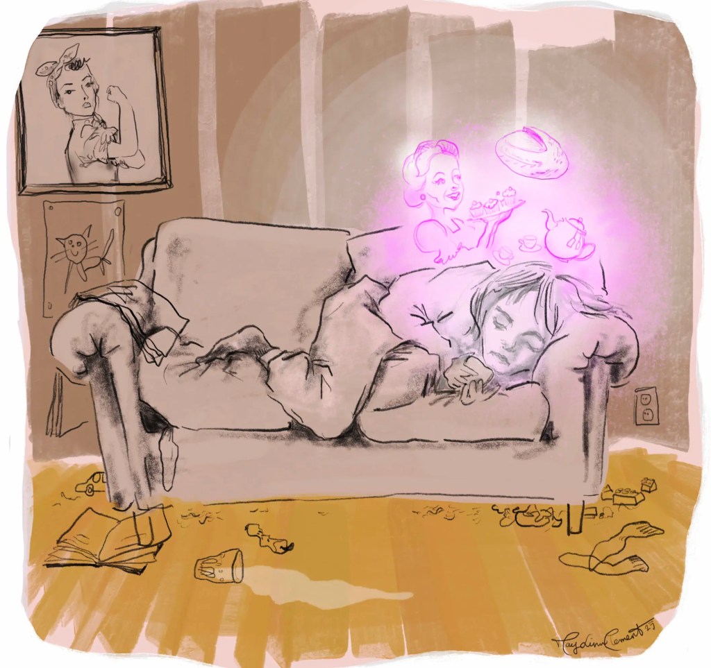 Eg har fantasert om vaska hår og reine klede og ryddig heim. Og når eg dagen deretter har sete i arbeidsskiftets tredje møte, då har eg drøymt om den vesle, varme toåringen min som eg same morgon forbanna meg sjølv for at eg fekk, og eg har lengta etter å halde han tett inntil meg slik desse forbanna influensarane er i stand til å gjere på unekteleg biletskjønt vis. Det viser seg at eg, ein progressiv feminist, har meir til felles med tradwifes enn hugnaden for mønstra skaut. Sambuaren min, som har registrert denne dissonansen i kjærasten sin, har døypt meg radwife.